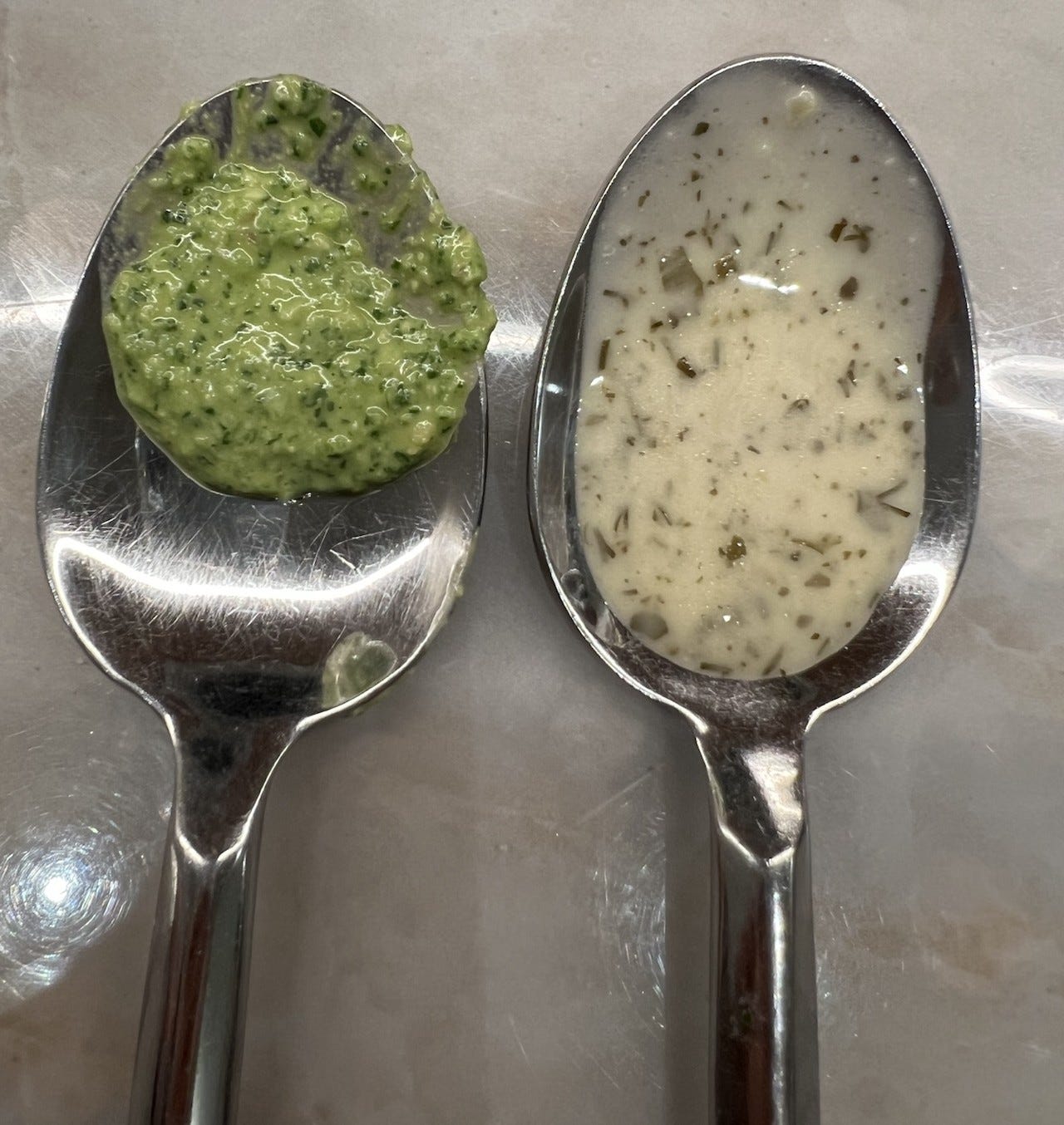 A taste test confirmed we had indeed made a good Green Goddess dressing, despite using too much lemon. I compared it to a store-bought version of Green Goddess dressing.